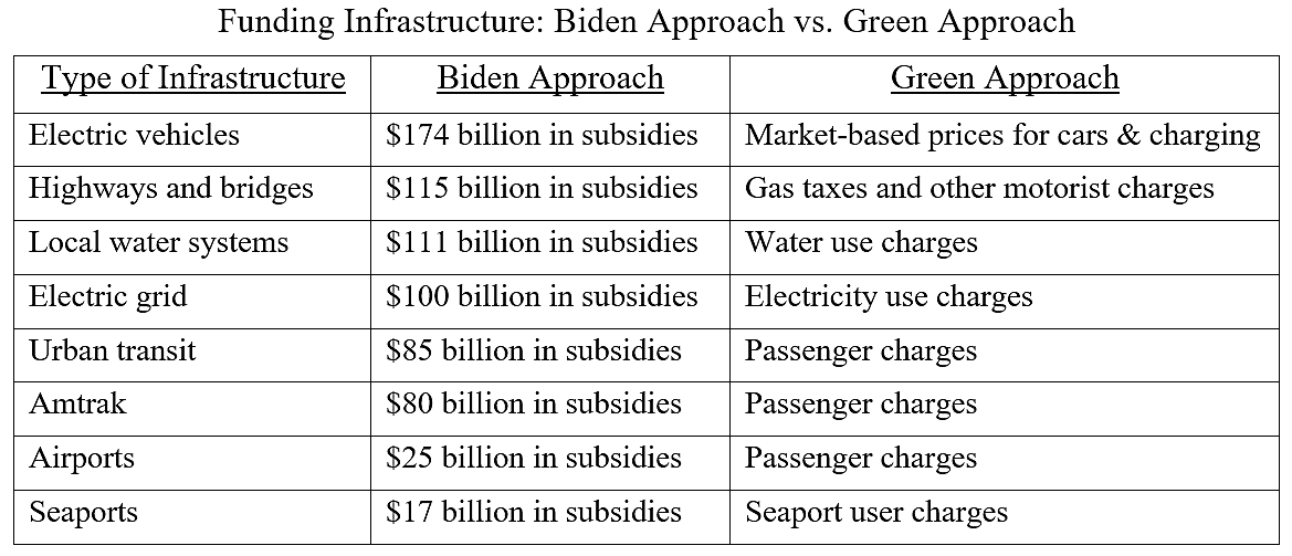 The table shows some of Biden’s proposed non‐green infrastructure subsidies and the preferred green funding approach.