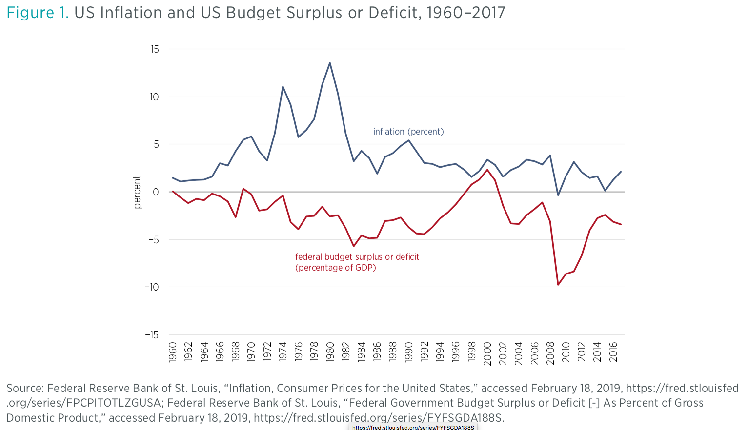 To illustrate this, figure 1 shows both the US budget deficit as a percentage of GDP and the inflation rate from 1960 to 2017. If MMT were correct, then one would expect to see increases in the deficit correlated with increases in inflation. However, despite dramatic increases in the budget deficit since 2001, inflation has not shown much variation.