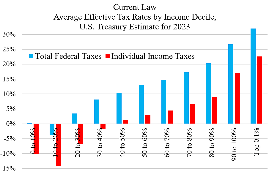As for billionaires paying lower tax rates than schoolteachers and firefighters, data from Biden’s own Treasury refutes the idea. Looking at the blue bars, schoolteachers and firefighters would generally pay only half the total tax rate of people at the top.